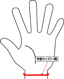 左手(右手)の手首一周を測定したサイズです。(下の図の下の図の赤線部分)